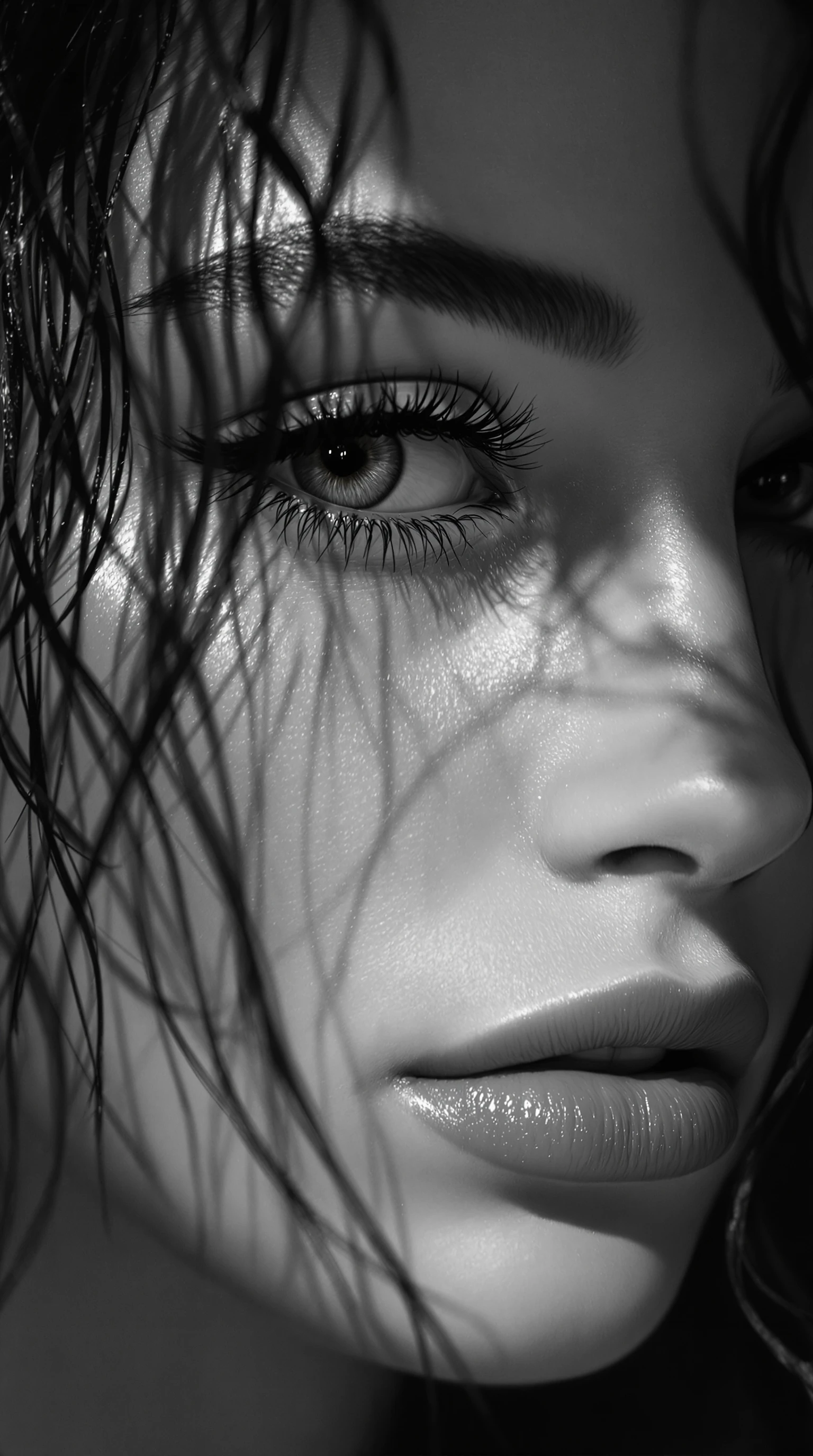 A hyper-realistic black and white close-up portrait of a young woman with intense eyes and natural beauty. Her face is framed by soft shadows and delicate strands of dark, wet hair that fall across her cheeks and forehead. The lighting is dramatic yet subtle, casting high contrast across her smooth skin and highlighting the fine textures of her lips, lashes, and pores.