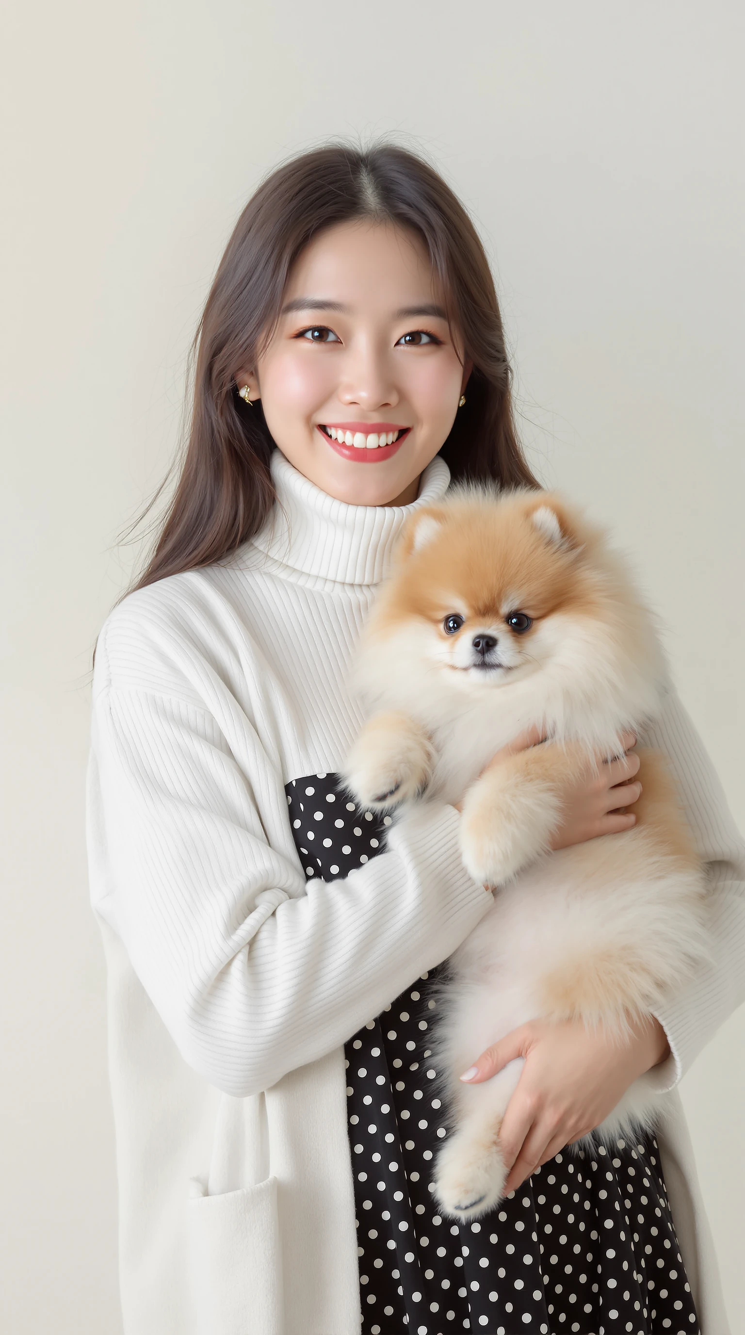 In the picture, a Chinese woman wearing a white turtleneck sweater and a black dress with white dots is holding a small, fluffy dog. The dog is an orange and white Pomeranian with fluffy hair. The person is smiling and holding the dog tightly to her chest. The background is light and simple, making the person and the dog the visual focus. The background is a variety of light block colors,