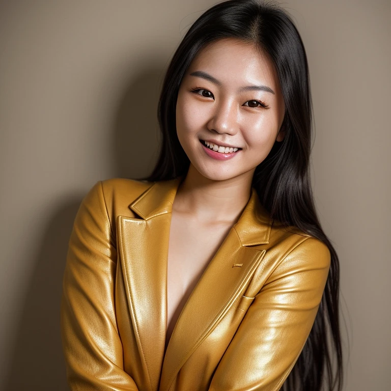 hyper realistic headshot photo of a 25 year old asian woman, wearing a golden leather suit, looking into the camera smiling slightly
