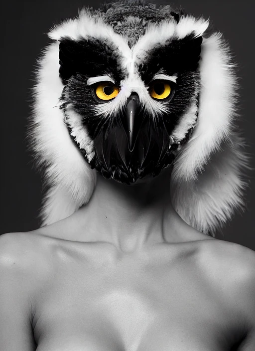 Black and white photo of a perfect body nude woman wearing an owl mask, [full view] , high contrast, high details, by Stéphane de Bourgies, studio quality, dramatic lighting, 8 k, hi res