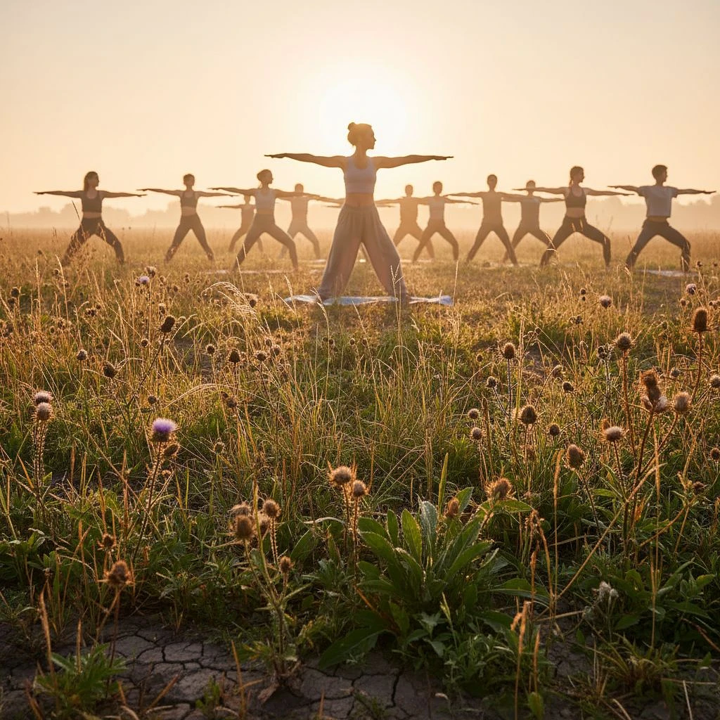 A fixed-camera shot (camera does not move) , positioned low to the ground in the middle of an abandoned field surrounded by wild vegetation, filmed in the early morning light with a soft cinematic glow. Foreground: Sharp focus on characteristic plants and tall grasses of an abandoned field, some green, some already dry, gently swaying in the wind. Background (far away) : A yoga class with a diverse group of stylish people practicing together. In front, a yoga teacher leads the session, facing the group and demonstrating poses. The group faces the teacher. All participants follow the teacher positions but not all are perfectly synchronized—some follow more slowly or imperfectly, adding realism. Style: Shallow depth of field, warm and slightly misty early-morning atmosphere, cinematic composition, with foreground sharp and detailed while the class in the background remains blurred and distant.