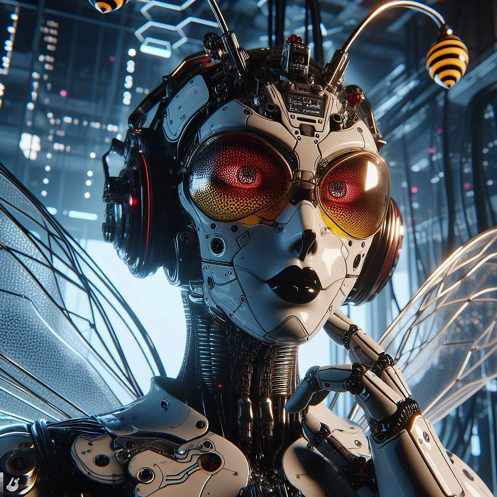 a cyberpunk-inspired scene featuring an anthropomorphic queen bee. Apply algorithmic artistry, mechanical designs, and chrome-plated aesthetics to enhance the character's appearance. Render the scene in 32K UHD for maximum visual detail and realism. Utilize UE5 parameters such as --ar 68:128, --stylize 750, and --v 5. 2 to achieve the desired visual effects. Maintain the dark background to emphasize the character,