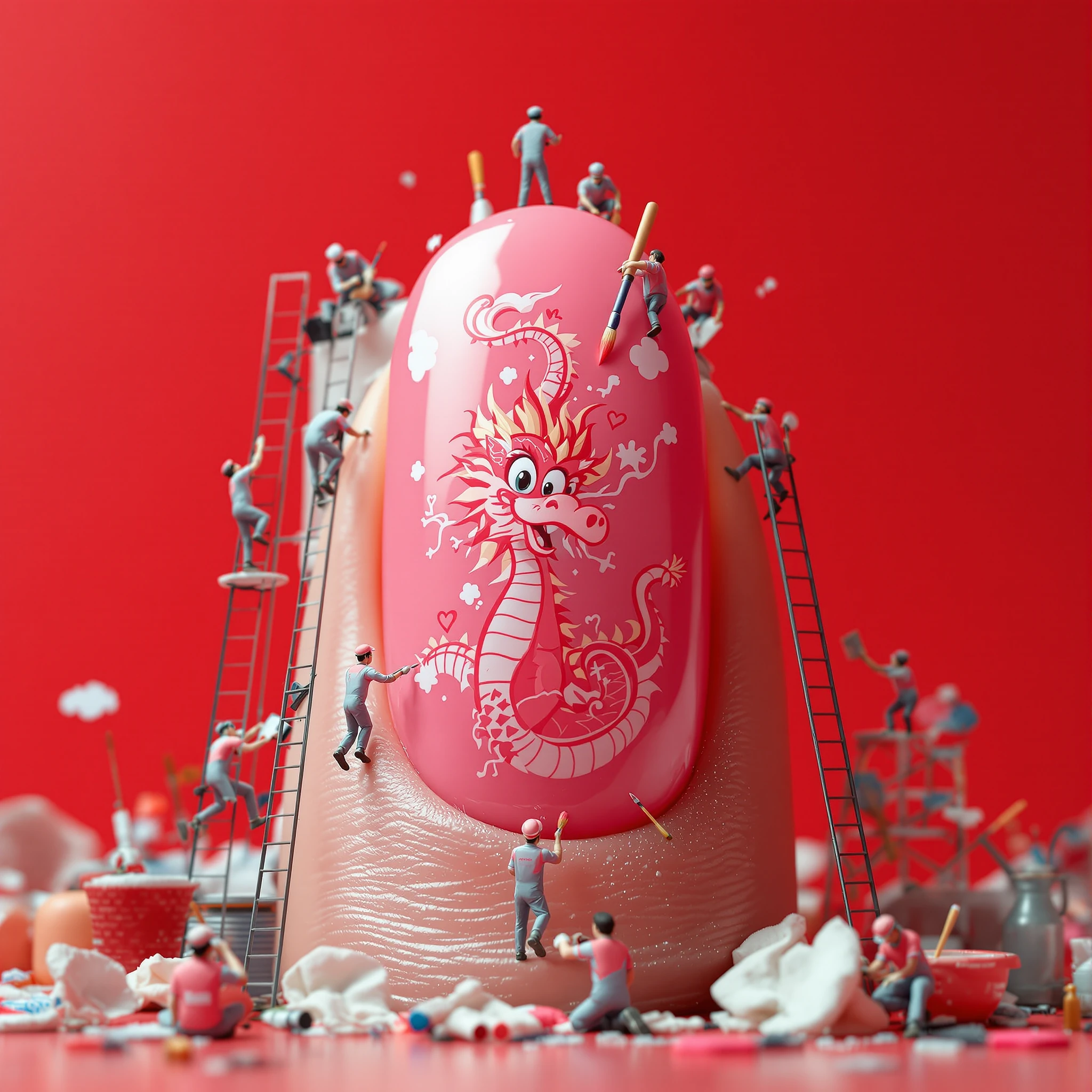 Tiny miniature workers in uniforms are painting and drawing cute cartoon pink dragon on the fingernails, maintaining the nails oversized paint brushes, others polishing with cloths, . They are positioned on ladders and small platforms, working meticulously as if performing dental maintenance on a giant structure. The background is a bold, vibrant red, creating a striking contrast. The scene is surreal yet photorealistic, with cinematic depth of field, ultra-detailed textures, and a whimsical yet professional aesthetic.