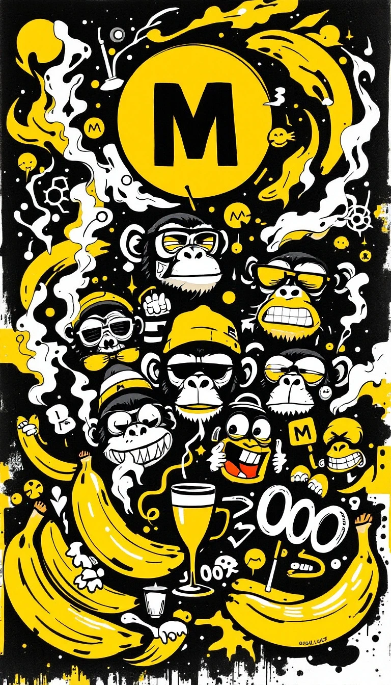 An intricate and mainly black, white, yellow, green, (two contrasting, extra colors for details) , graffiti-style poster featuring various elements, such as cartoon chimp gang characters, symbols of urban culture, smoke, geometric formes, abstract lines and dynamic expressions, focusing on minimalistic chimp faces, the letter 'M' inside a large circle, bananas, beer, is part of the image. the word and '2007' is hidden --ar 63:128 --stylize 750