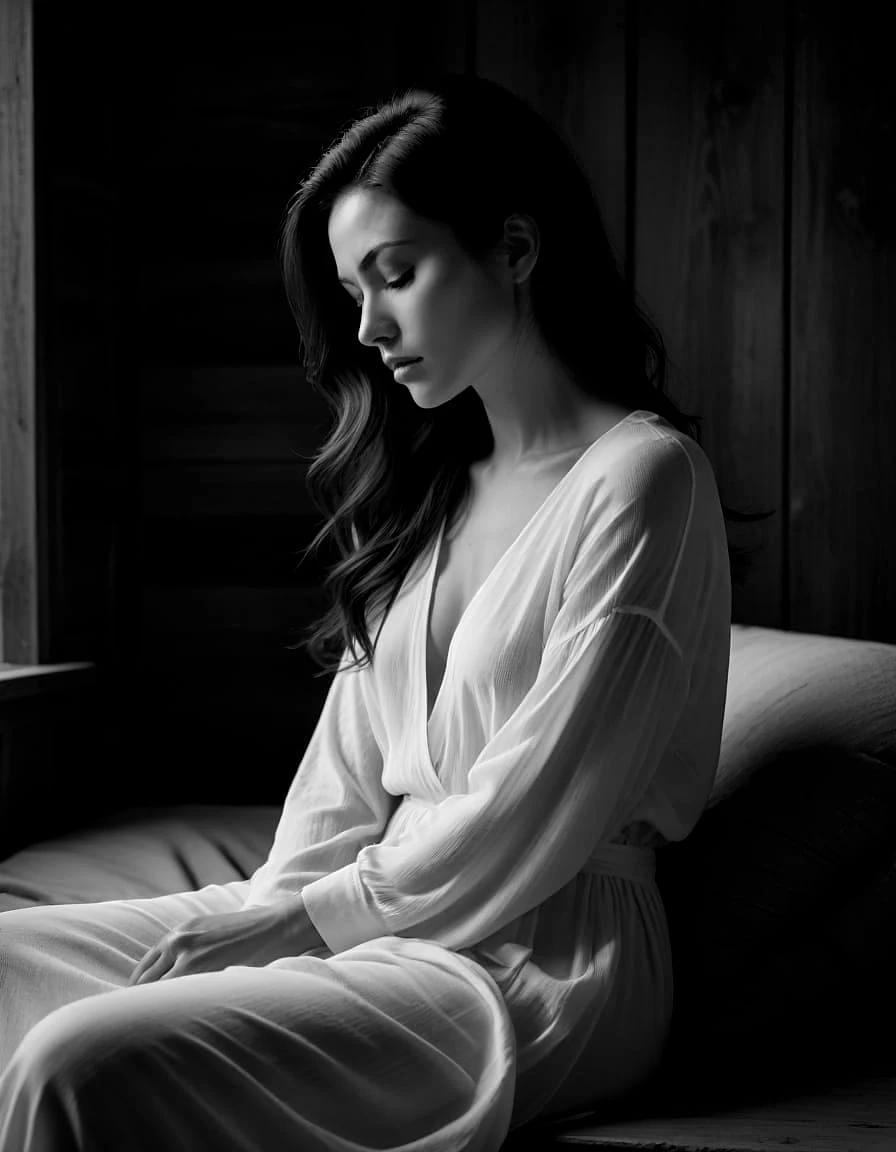 A hyperrealistic, fine art black-and-white portrait capturing an introspective moment, with a woman gazing thoughtfully downward, her hand gently resting in her rich, dark hair. Her skin tone is subtly deeper, adding warmth and contrast to the scene. She is partially draped in a loose-fitting fabric that softly contours her form, bringing depth and elegance to the composition. Soft lighting casts delicate shadows, emphasizing her natural features and creating a serene, contemplative expression, suggesting a quiet moment of reflection. In the background, a cozy cabin room adds warmth to the image, with wooden walls and rustic textures that evoke a sense of intimacy and comfort. The muted background enhances the minimalist, timeless aesthetic, focusing attention on her graceful form and introspective mood. A refined, evocative piece that captures both elegance and emotional depth, suitable for fine art photography or gallery display.