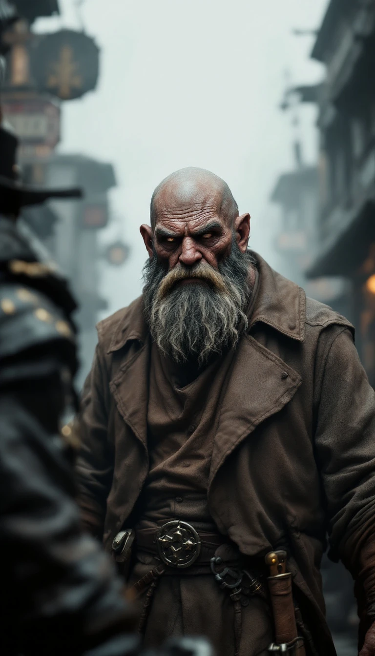 "Jerry, a highly realistic and anthropomorphic character with a rugged and aged appearance, is dressed in old-fashioned clothes reminiscent of the Wild West. The character’s skin is textured with rough, detailed layers, featuring sharp wrinkles and a thick, expressive beard that exudes strength and determination. Jerry is shown in a close-up shot, standing in the middle of a foggy street, holding a sword in hand, poised and ready for battle. The earthy tones of Jerry’s appearance contrast sharply with the dim and gloomy background, while a formidable enemy confronts him in the foreground, adding drama and intensity to the scene. "