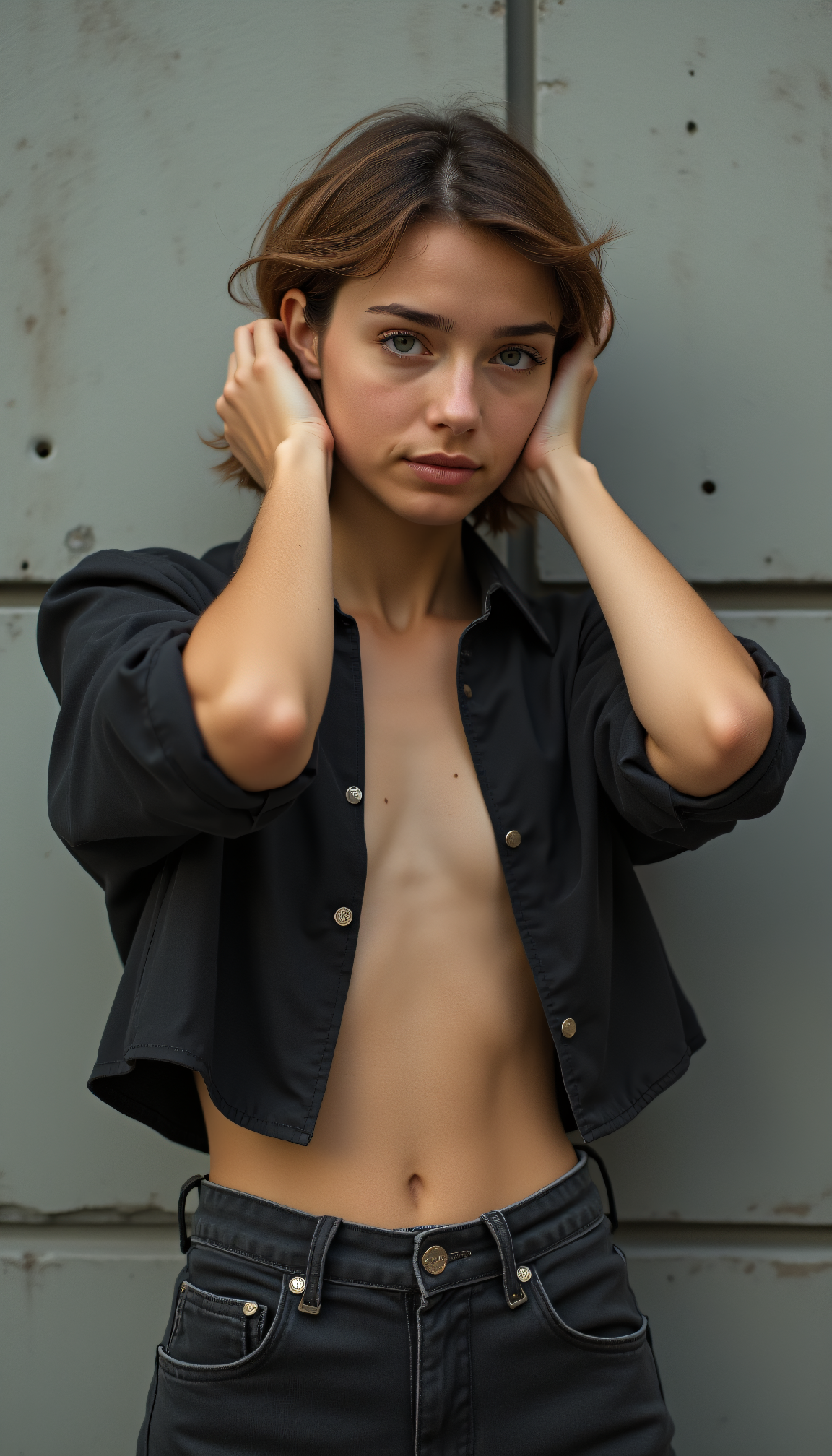 street photography, Brutalist high Fashion shot from a distance photo of a 24 year old Uralic-Zulu female radiant bride with Subtle defiance expression. Her body is Tight, sculpted obliques that frame a flat stomach, toned muscles, abs, small breast, flat chest. She has Light beige skin with subtle freckles across the cheeks and shoulders. The skin pores and texture are clearly visible and in focus. Her Large comma-shaped eyes, Deep, ocean blue eyes, framed by long, elegant eyelashes. Her haircut is Textured pixie with undercut. Her haircolor is Rose gold hair. Her eyebrows are Brow-straight shaped, complementing her delicate facial features. Her outfit is Monolithic block-inspired jacket, midriff, Industrial safety strap pants, She poses in She poses with both hands in her hair, creating movement and framing her face, with a slight smile that adds a playful touch.. in the background Heavy concrete fortifications, lights Diffused light through translucent concrete blocks in the style of Vladimira Miksic