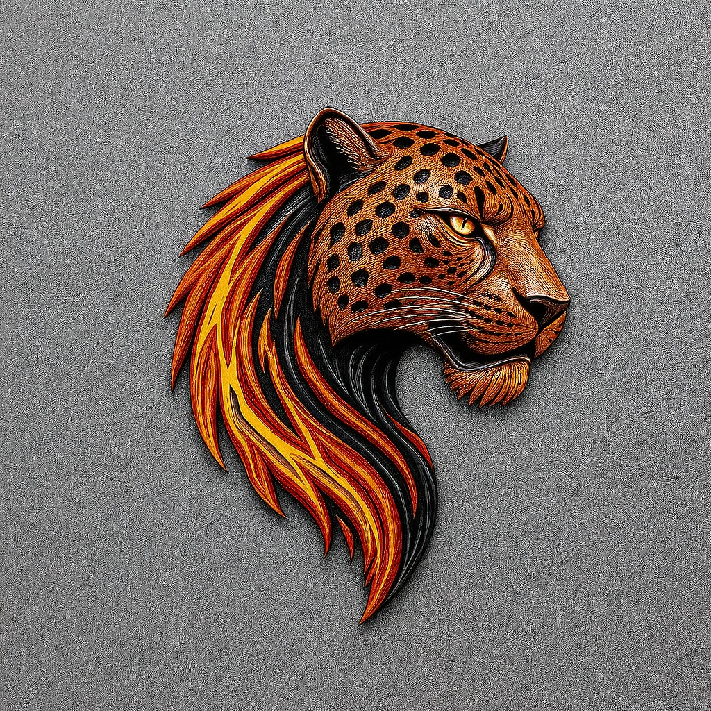 a logo of a majestic bronze-wooden leopard statue with detailed flame textures, showcasing a blend of metallic and natural wood finishes. The design should have a sleek, modern aesthetic with bold lines, highlighting the fierce and elegant features of the leopard. Incorporate subtle flame patterns into the texture to emphasize power and artistry, using warm tones of bronze, rich wooden browns, and fiery accents. Keep the composition balanced and suitable for a striking logo design