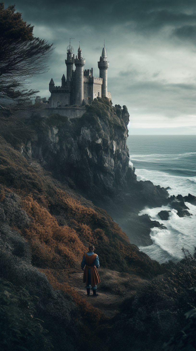 Midjourney prompt: A magnificent castle on a cliff edge overlooking t...