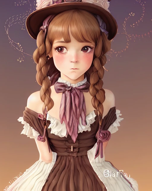 a girl as ( fantasy personification of chocolate cupcake ) , character design, cute hats, victorian inspired clothing, unreal engine, highly detailed, smooth, digital illustration by artgerm, studio ghibli, sharp focus, artstation. ribbons, fractal swirls. a fantasy bakery background by studio ghibli, makoto shinkai, global illumination, blender, maya 8 k