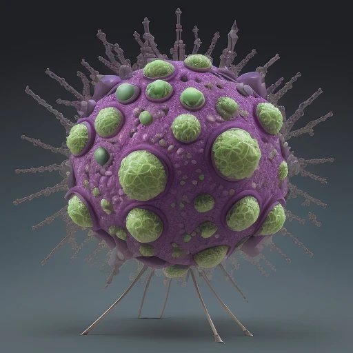 Create a detailed and visually compelling 3D image of a spherical virus, showcasing its individual components. Emphasize key structural elements such as the viral envelope, capsid, and any other relevant features unique to spherical viruses. Utilize a color palette that enhances the distinction between different parts, providing a realistic and scientifically accurate representation. Pay meticulous attention to the three-dimensional aspects, ensuring a lifelike and immersive portrayal of the virus. The image should serve an educational purpose, offering a comprehensive visualization of a 3D spherical virus and its distinct parts. Cater the representation to a scientific audience, promoting clarity and accuracy in the depiction