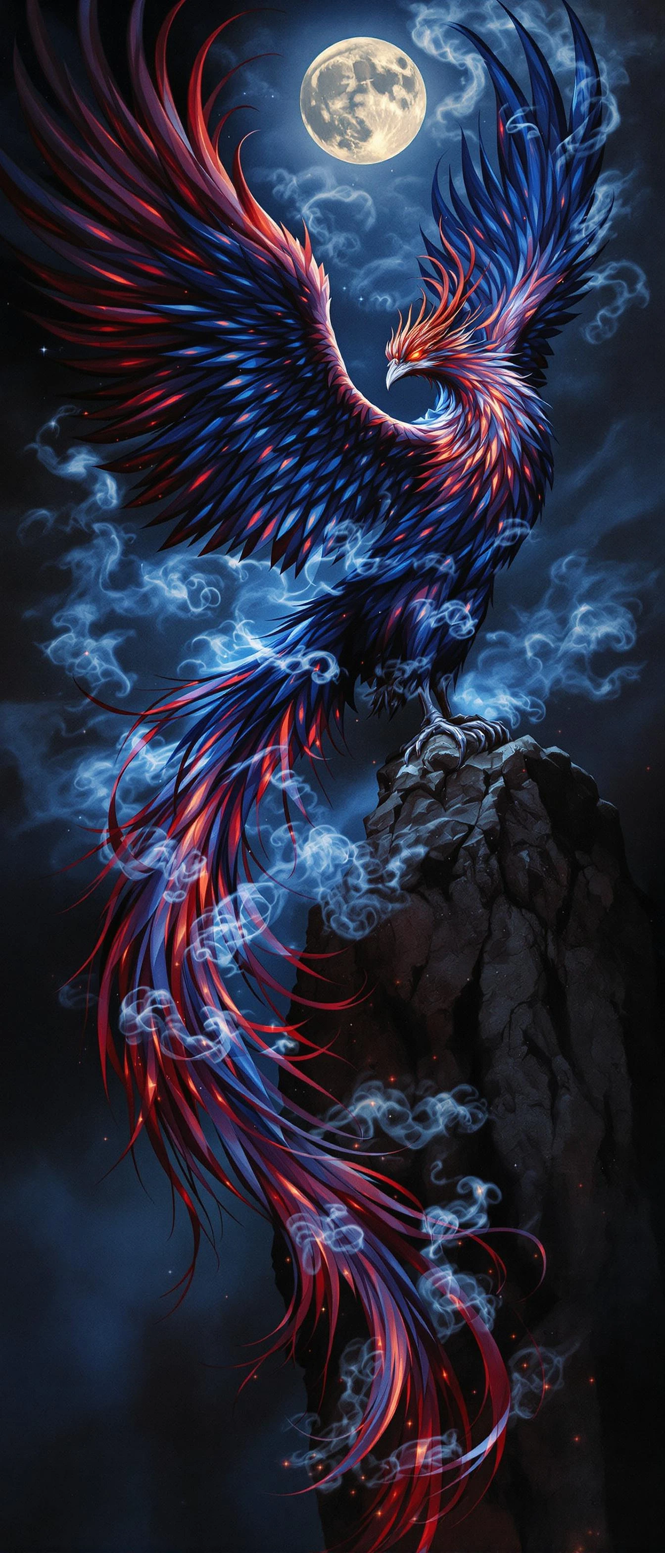 "A majestic Phoenix rendered in rich burgundy and deep blue, its feathers shimmering like an opal under moonlight. Chiaroscuro lighting emphasises the graceful curves of its wings, casting strong contrasts and deep shadows that make the mythical bird appear both mysterious and powerful. Sophisticated and elegant in style, it perches atop a craggy cliff, surrounded by a swirling mist that dances gracefully around its fiery talons, creating an ethereal atmosphere. The scene is reminiscent of a gothic painting, full of enigma and grandeur. "