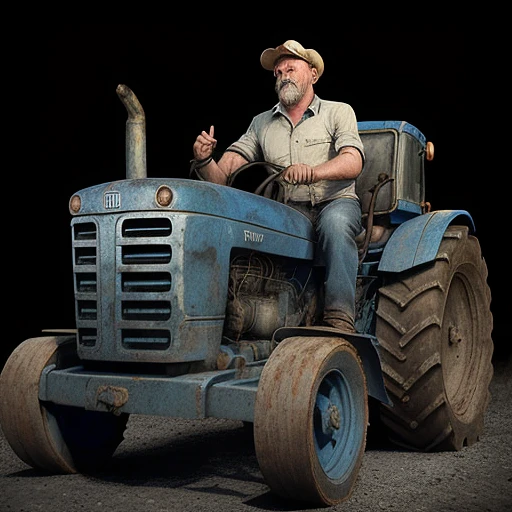 Blue tractor man sings into a microphone, old metal, on black background, cinematic, hyper realism, high detail, octane render, 8k, full hd 4k --sref https://nizhnij-novgorod. art-fresco. ru/upload/webp/iblock/7a0/jgwjp893lam0jlm1aflnjt5h56mp2kp0. webp