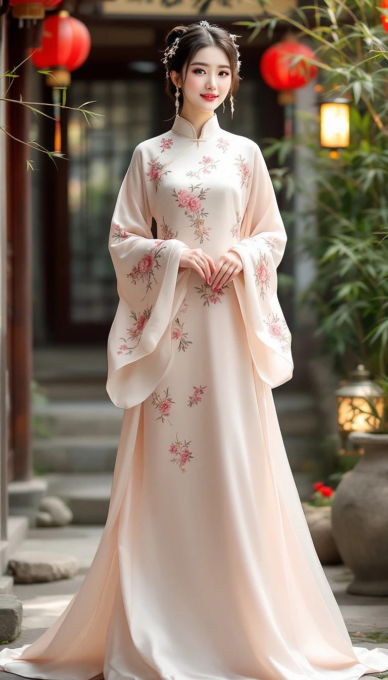 A beautiful woman wearing a traditional Ming Dynasty Hanfu, styled in a Chinese fashion with elegant and flowing lines. The outfit features soft, flowing silk fabrics in pastel colors, with intricate floral embroidery. The design is traditional yet feminine, with a layered structure including wide sleeves and a flowing skirt that reaches the floor. The woman stands in a poised and graceful manner, possibly holding a fan, with her hair styled in a classical Chinese updo, adorned with delicate hairpins. The background features elements of Chinese culture, such as a traditional garden with bamboo, stone paths, and lanterns. The atmosphere is serene, with a focus on the elegance and refinement of the outfit, highlighting Chinese aesthetics from the Ming Dynasty era.
