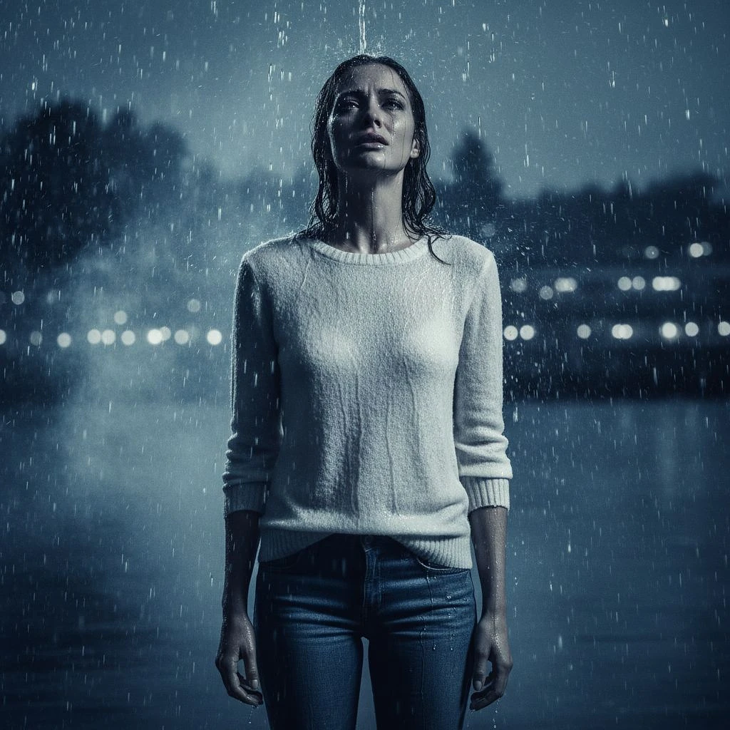 Create an image with the attached photo of an elegant woman standing in intense rain, soaked, and a semi-wet white wool sweater and jeans that artistically clings to her body. She looks up with a cinematic and emotional expression. Raindrops are suspended in the air, with dramatic lighting in cool blue tones, and a soft mist in the background, with a shallow depth of field. Editorial fashion session style, aesthetic, captured in ultra high resolution