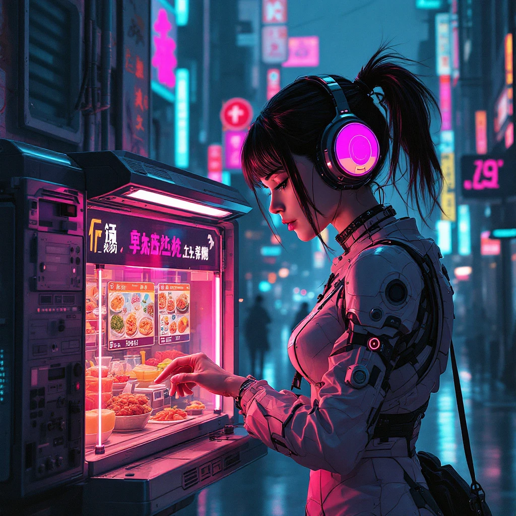 girl of the future using a food vendor machine, futuristic design, electronic artwork, manga character, techno-noir, animated drawing, vintage futurism, pan futurism, dystopian cyberpunk, neon-lit urban landscape, dark and gritty, high-tech, graffiti, futuristic gadgets, cinematic, detailed cityscape, moody lighting, ultra-detailed, urban landscape, high-tech implants, augmented reality