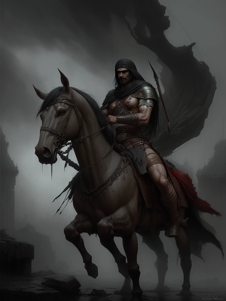 portrait of a brutal Arabian warrior, rainy, epic composition, emotionally profound, symbaroum, digital painting by Martin Grip, Gustaf Ekelund, Jakub Rozalski, Bernie Wrightson, Frank Frazetta
