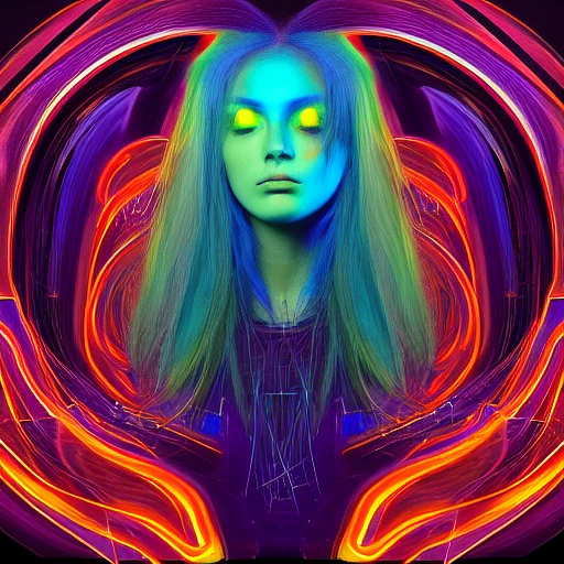 Abstract bioluminescent portrait of a determined beautiful woman with long iridescent hair, gritty swirling purple vibrant cybernetics, digital UI, abstract blocks, glitch art, hacking effects, glitch effects, digital tech effects, chromatic, color blocking! , octane, object-centered, oil on canvas, cyberpunk, symmetrical, Red, concept art, abstract, trending on art station