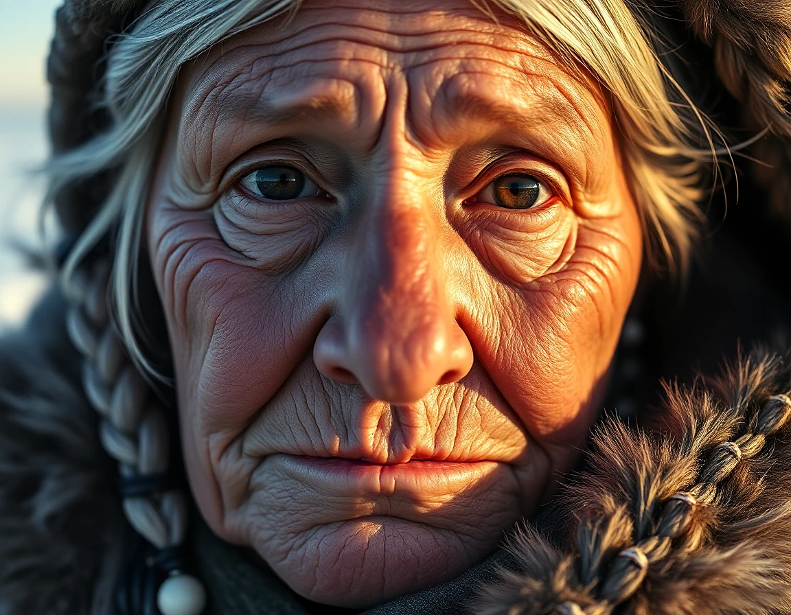 Hyperrealistic close-up portrait of an elderly Inuit woman in her 80s. She should have deep wrinkles, weathered skin, and wise, piercing dark eyes. Her silver hair is braided and adorned with traditional bone beads. She's wearing a fur-trimmed parka. Capture the soft, golden light of the Arctic midnight sun reflecting in her eyes and on her skin.