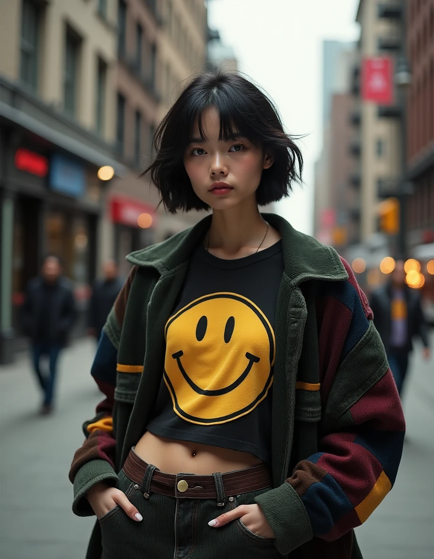 High fashion photo medium shot of a young asian female supermodel, slim, small breast, flat chest, toned abs, with short messy black hair, Smiley face print t-shirt, midriff, Patchwork corduroy flares, Casual slouch in oversized jacket , rule of thirds, in the background Downtown city street with tall buildings, lights Metallic reflector the model is lighted with soft natural lighting