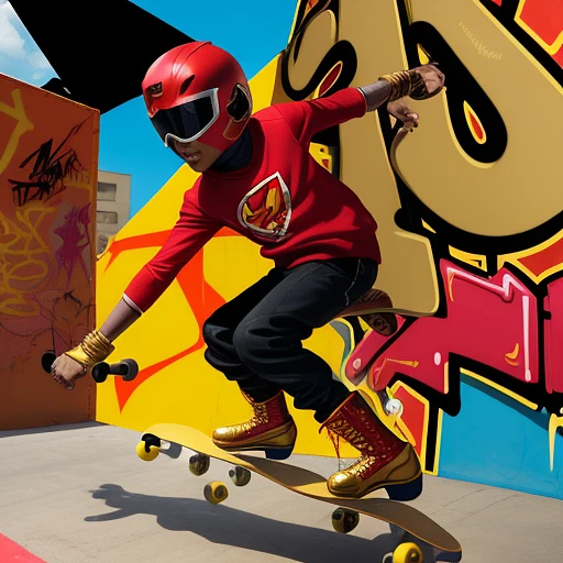 Panel 5 a red suited superhero,  brown skin boy with a power ranger helmet baseball cap backwards,  wearing sunglasses,  gold boots and gold gloves riding on a skateboard,  flying off a skate ramp like a rocketship superhero. . . in a graffiti covered skate park.