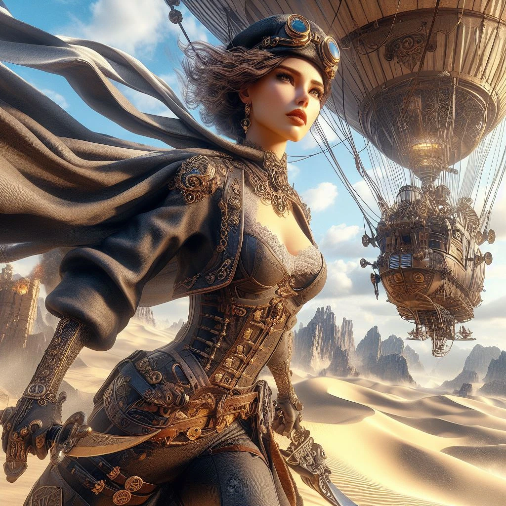 Steampunk aviatrix in ornate attire with flowing cape, standing against a backdrop of a vast desert and a grand airship anchored in the sky.