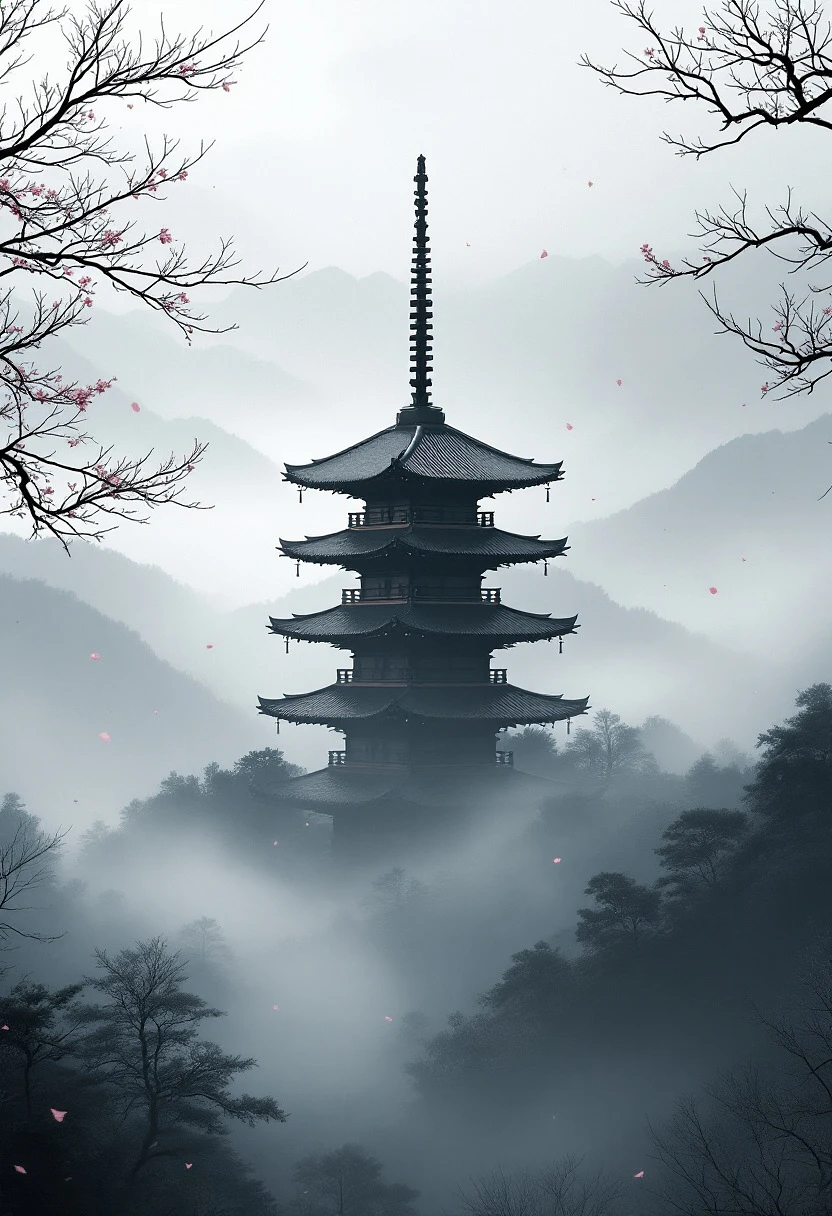 Traditional Japanese pagoda standing tall in a foggy mountain valley, centered mid-range view. Dense mist surrounds the base and rolls through the distant layered hills. Entire scene rendered in monochrome grayscale tones no color grading, no blue skies, no warm lighting. Subtle pink petals drifting in the air, very minimal, only as soft atmospheric accents. Bare trees or branches frame the scene on the sides no full cherry blossom trees, no foliage covering the pagoda. Moody ink wash aesthetic, inspired by Ghost of Tsushima, cinematic but restrained. High detail in the pagoda structure, soft shadows, calm and mysterious tone. Minimalist, peaceful composition with deep atmosphere and silence.