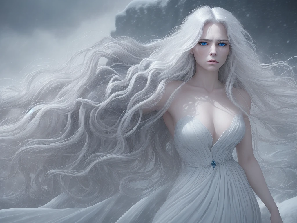 a breathtaking portrait of a woman with an aura of mystique, set against a backdrop of intense drama and passion. The scene unfolds like a sweeping epic, with the woman standing at the forefront, her long, wavy white hair cascading down her back like a river of snow. Her striking blue eyes seem to burn with an inner intensity, as if illuminated by a fierce passion. Her attire is a masterful blend of form and function, featuring a stunning black and gold hooded cloak that billows behind her like a dark cloud. The cloak is adorned with intricate gold accents, adding a touch of luxury and glamour to her overall appearance. A delicate gold necklace graces her neck, complemented by elegant gold earrings that add a touch of sophistication to her ensemble. Her nails are painted a deep, glossy black, adding a touch of edgy drama to her overall look. In her hands, she holds a book that appears to be engulfed in flames, adding a touch of drama and tension to the overall scene. The flames seem to dance across the pages, casting a warm, golden glow over the woman's face. The background of the image is a fiery blaze, with flames licking at the edges of the scene. The colors are muted, with shades of orange, yellow, and red dominating the palette. To the left of the woman, a dark and ominous landscape stretches out, with twisted trees and jagged rocks looming in the distance. The sky above is a deep, foreboding grey, with clouds that seem to swirl and twist in every direction. The overall effect is one of intense drama and passion, as if the woman is channeling the raw energy of the flames into her very being.
