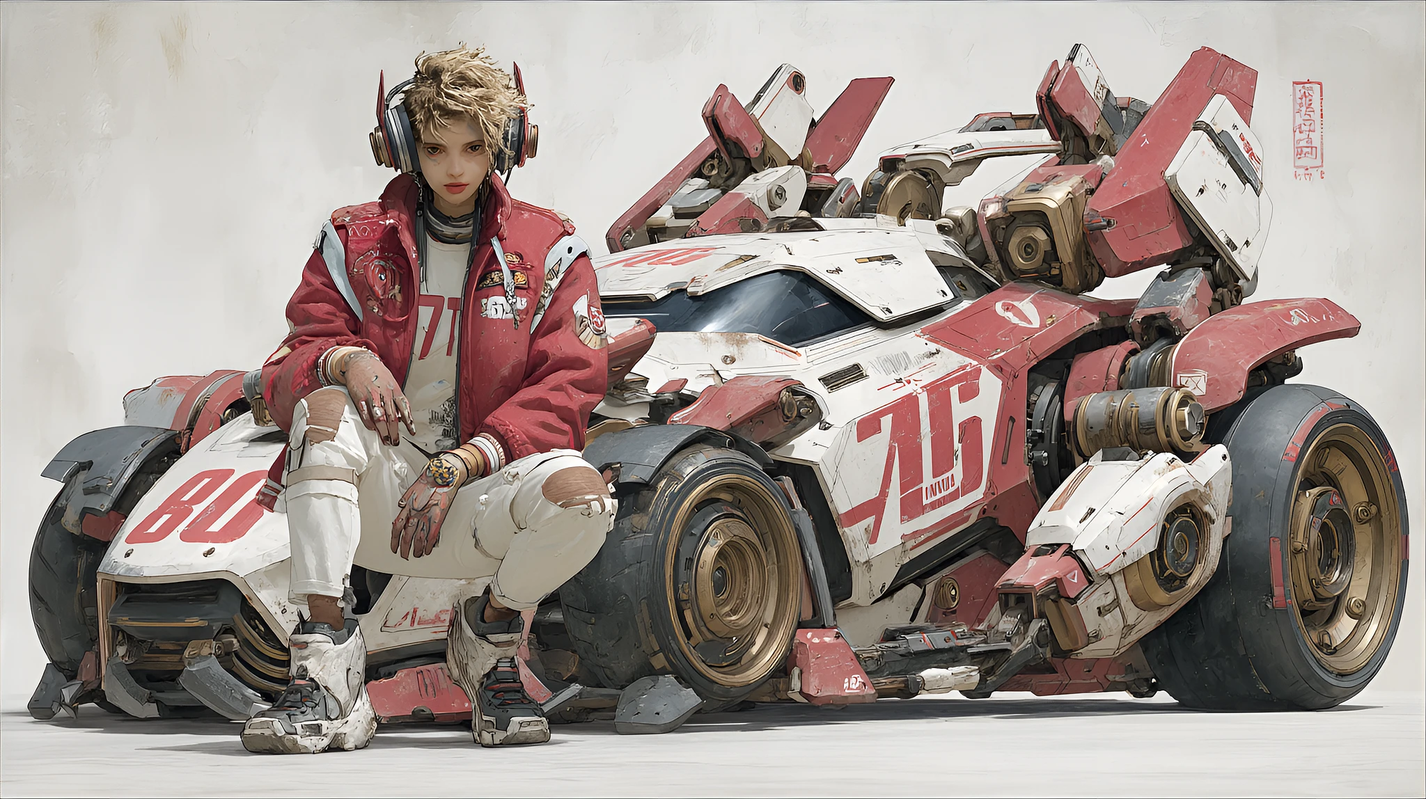woman is crouched next to a large, red and white robot that resembles a vintage-style sports car