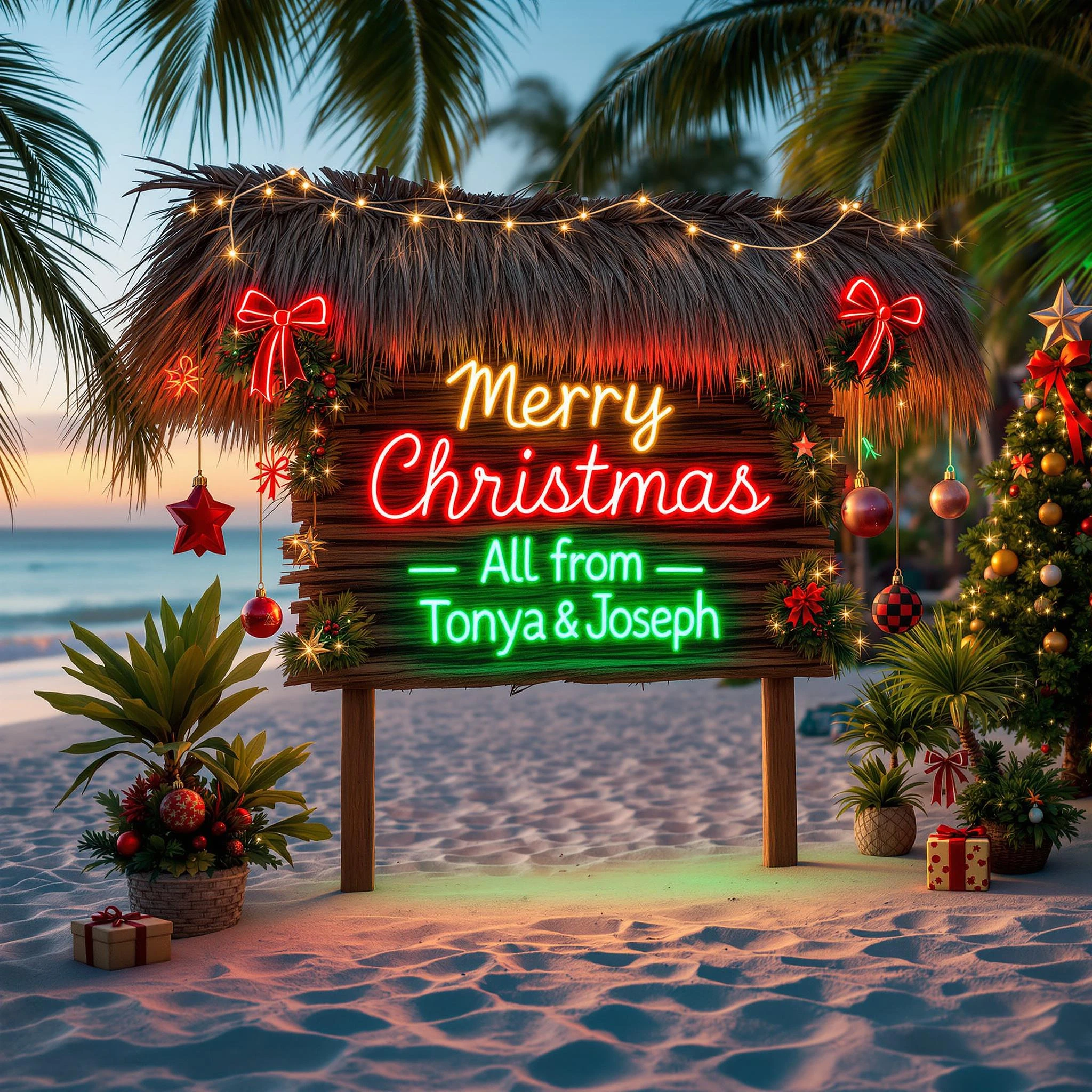 Beachy holiday scene, lots of Christmas decorations, thatched sign made of palm fronds, red and green neon letters saying "Merry Christmas All from Tonya & Joseph", sandy beach, tropical setting, festive, vibrant colors, cheerful, sunset lighting --ar 16:9 --v 6 --style raw