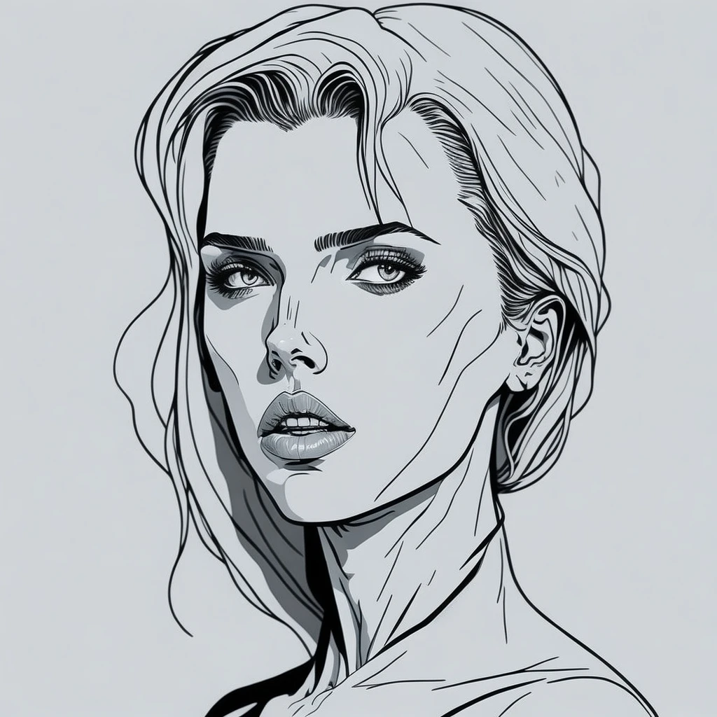 Scarlett Johansson in the style of Patrick Nagel's art, white face, line work