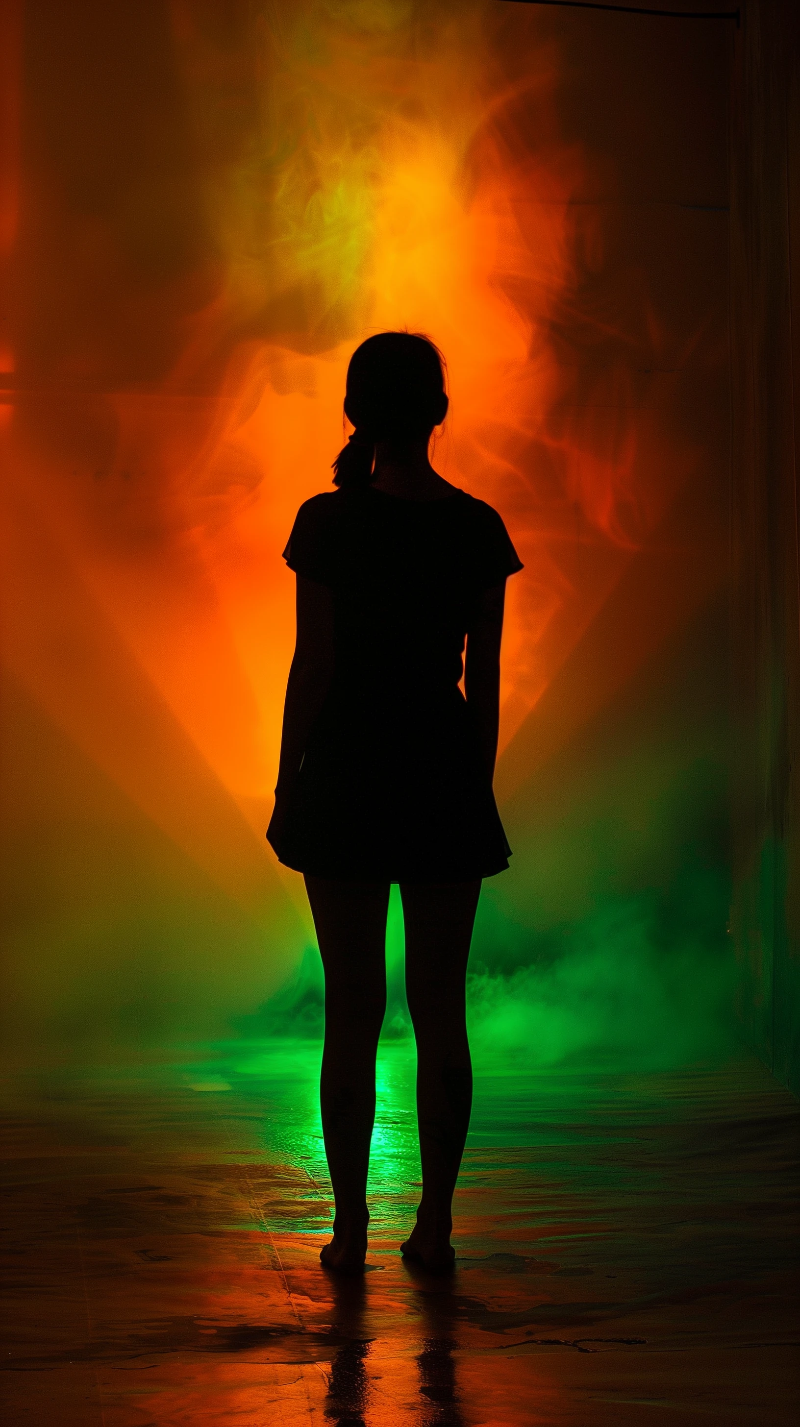 silhouette of a woman standing under vibrant colored lighting, orange, green, and yellow lights illuminate from behind creating a mysterious ambiance, warm and deep lighting dramatically outlines the figure --ar 9:16