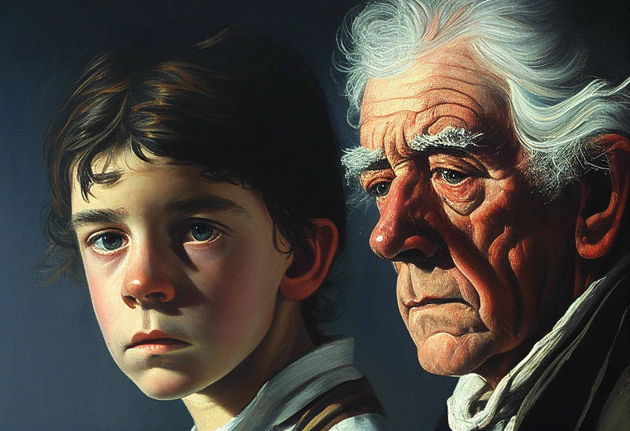 portrait of an old man and a young boy, acrylic, Daylight, by Francisco Goya, by William Morris, by Rene Magritte, Realism, ZBrush, Close-up perspective, Made of acrylic --uplight --ar 3:2 --q 5