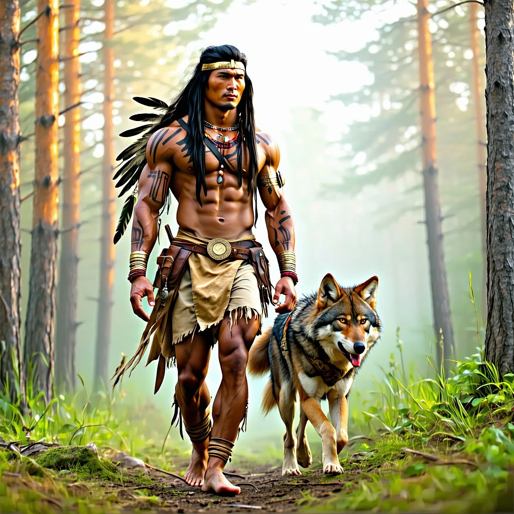 A full body image of a native American young adult male, tall, slim, very toned, red shiny copper skin tone, very long black silky hair, blowing in the wind, gold headband, shoulder bag, gold loincloth with a knife sheath attached to the side with two eagle feathers attached to it, tribal tattoos on his face, neck, upper body and arms, gold gauges in each ear, bracelets and anklets, walking barefoot through the forest, a red wolf with gold collar walking by his side