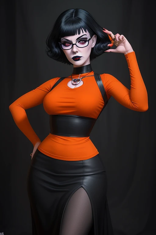 goth girl astestic, velma from scooby-doo, a woman wearing eye glasses and an orange top, goth style mood, dark eye makeup, in the style of jessica drossin, kitsch, kieron gillen, golden age aesthetics, dima dmitriev, life-size figures, catcore --ar 51:91 --niji -