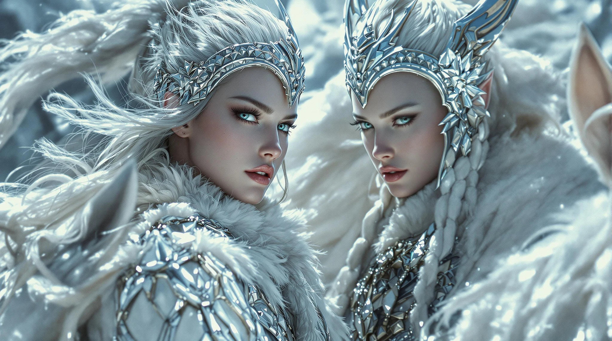 A grand fiction close up scene in a classic movie poster style, hyper realistic depicting valkyries, warriors woman , , on horses on white with scultured armoured horses, the skin is pale, the features sharp, and with white and silver iridescent clothing with thick fur contrasts with white and cool tones. The lighting is dramatic, with visible rich textures. Heroic elements and a massive scale are emphasized.