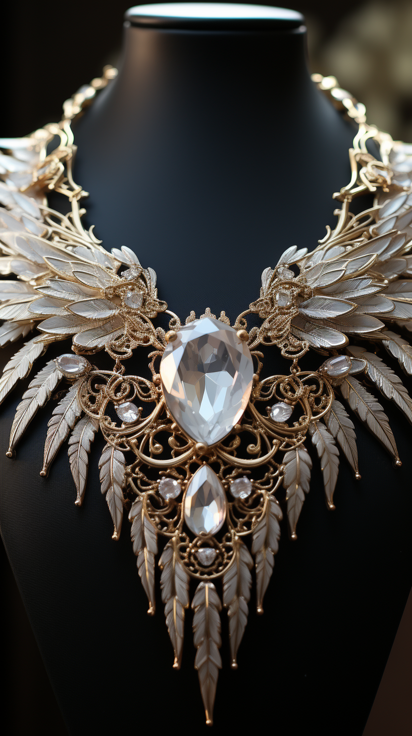 dramatic gold, white gold,elegant, crystal quartz, pearl, human angel featured collar style necklace. Large faceted ice crystal angel wings wrap around collar, golden inlay, ice crystal angel person standing as the main feature,ultra realistic, exquisitely designed and detailed, octane render, hyper realistic, clean, object photography, illumination lighting,closeup, product view, 32K --v 5.2 --s 500 --no background --ar 9:16