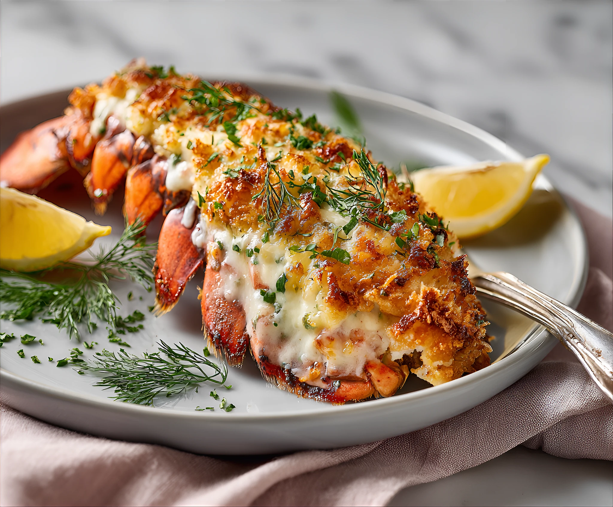 A whole lobster tail, cooked and topped with a creamy cheese sauce and herbs, sits on a light gray plate. The lobster tail is a deep reddish-pink color, with a golden-brown, crispy cheese topping. Fresh dill is sprinkled over the sauce. Two slices of lemon are positioned beside the lobster, providing a vibrant contrast in color. The plate is round and rests on a marble surface. A delicate, light pink linen napkin is draped in the lower left quadrant of the image. A silver fork is visible, resting on the napkin and plate. The lighting is soft and highlights the food's textures and colors