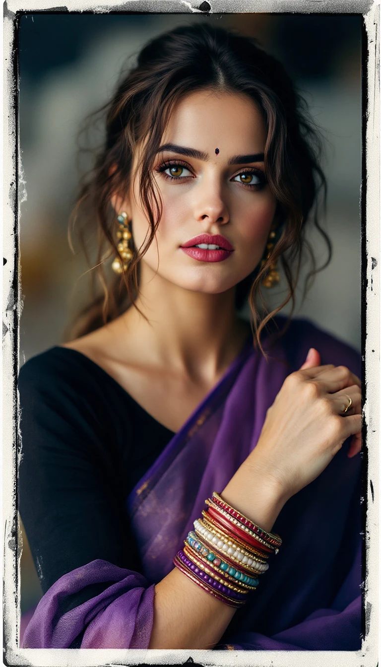 Polaroid camera, Hayley Atwell , 24-30 years old, trying to love, showing bangles on hand, bindi, high-quality photo portrait, environmental, double eyelid --ar 34:65 --style raw, wearing violet transparent sari with black silk blouse, includes full body.