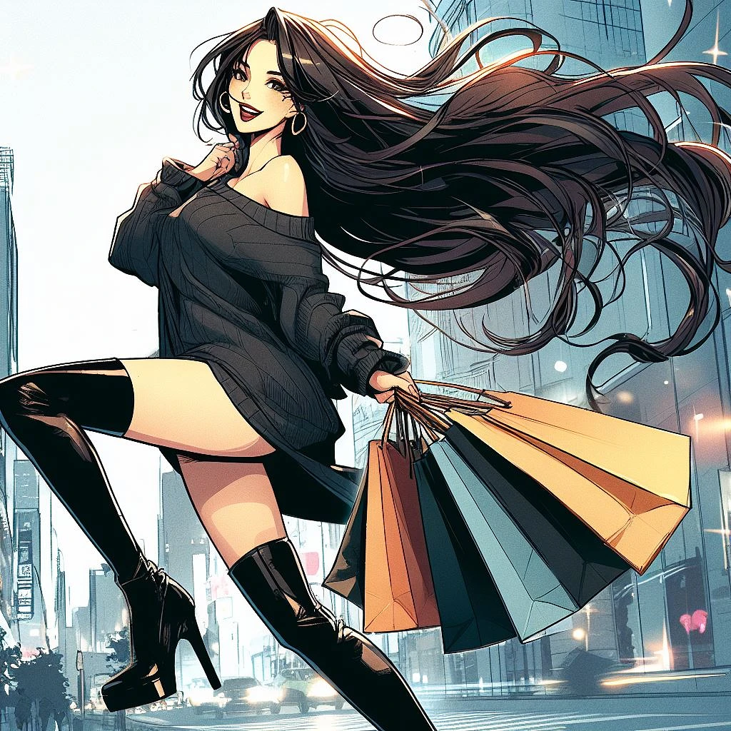 digital art, best quality, manga style, solid manga colors, ambiant color, vibrant colors, full-length body shot, stunning thin eurasian type woman with long dark hair, ponytail, frantic shopping in the city streets, holding five shopping bag, city background, wearing long sleeves off-shoulder sweater, long black high heel boots, hair flowing with movement, dynamic pose, expressive happy face, large smile