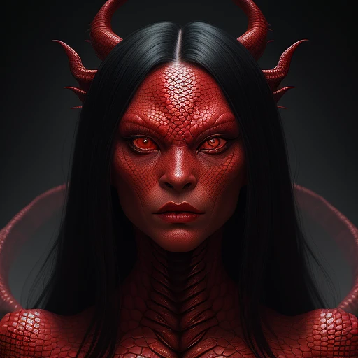 Full portrait of an alien female draconian shapeshifter, red dragon scaly reptile skin, beautiful attractive face, crimson eyes, puffy lips, long black hair, in focus, digital design masterpiece