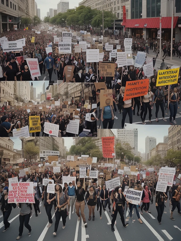 A united group of protesters marching through a city street, their banners and signs raising awareness for an important cause, their determined expressions reflecting their passion and commitment. Artwork, using mixed media techniques to combine photography and collage, capturing the diversity and unity of the protesters, --ar 1:1 --v 5