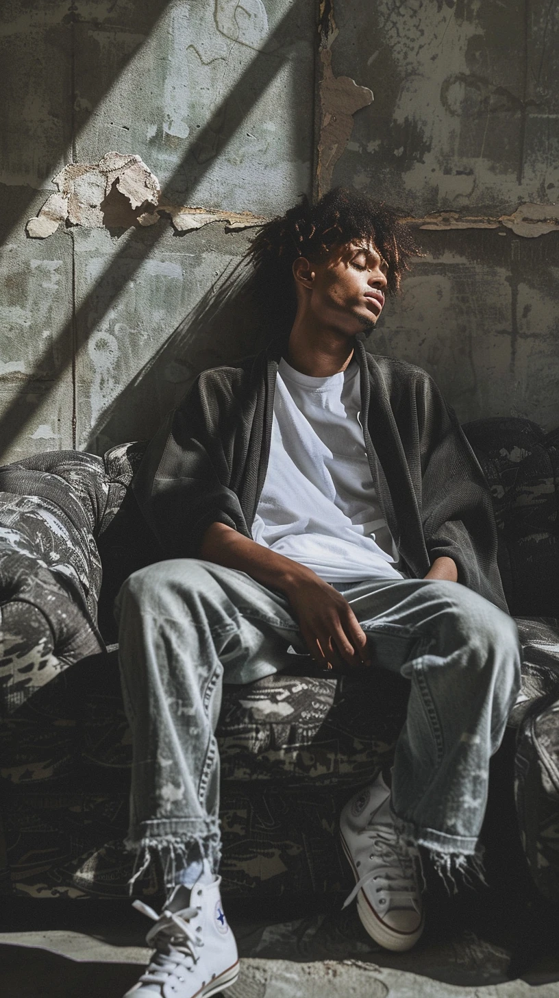 capture a man lounging on a worn camouflage texture sofa, casually dressed in a white t-shirt and a long black cardigan, with relaxed denim jeans and converse high-top sneakers, setting is urban, with a rough concrete wall in the background and shadows from the window creating patterns across the scene, suggesting a lazy afternoon in a chic, yet slightly dilapidated city apartment --ar 9:16 --style raw