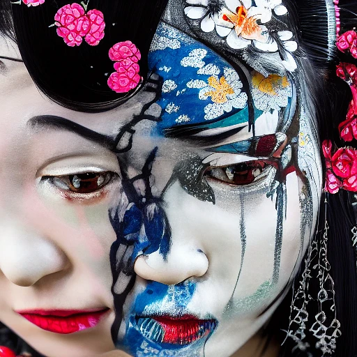 wet paint, portrait of Japanese black-haired geisha, with a depressed look, In a flowered kimono, with battle marks on her face, hypermaximalist, elegant, super detailed, 32k, insanely detailed and intricate, Photography, Photoshoot, Shot on 70mm lense