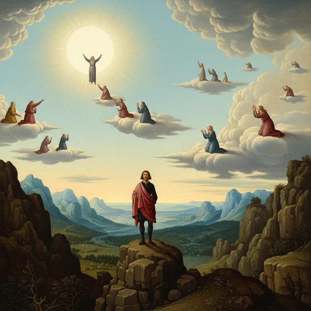 A collaborative-style painting in the fusion of Joos de Momper and Max Ernst. A lone man stands in the foreground atop a craggy precipice, facing the viewer. His posture is poised, contemplative — he is moments away from stepping off into the air to join a procession of distant figures drifting serenely on a cloud that floats past. The sky is vast and strange: De Momper’s sweeping, mountainous vistas dissolve upward into Max Ernst’s textured, dreamlike heavens. In the distance, on other clouds at varying altitudes, more human figures are visible — some kneeling, others with arms outstretched — each imploring the radiant, unblinking sun high above to accept them into a distant, glowing realm known as the ‘otherworld’. The atmosphere is charged with longing and transcendence, mixing northern Renaissance clarity with surreal, subconscious symbolism. Colors are muted earth tones below, with ethereal pastel hues in the skies above