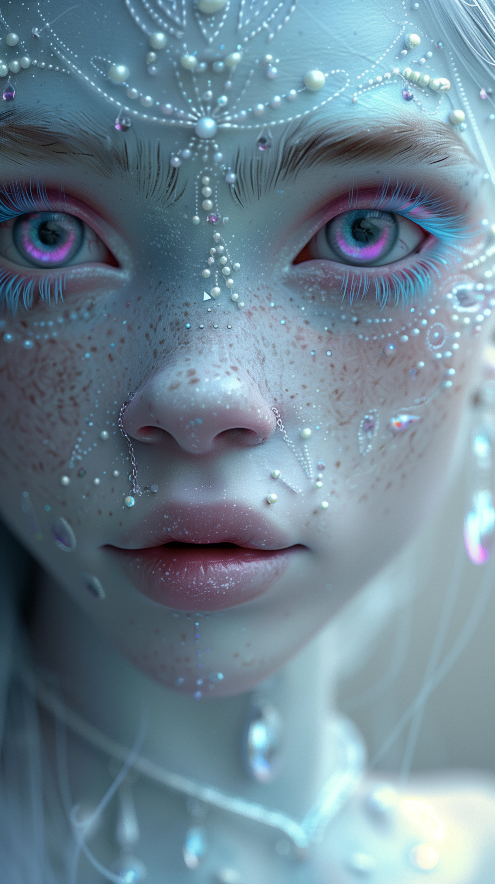 /imagine prompt:A close up of an alien woman with pink eyes and blue skin, in the fantasy art style, trending on cg society, trending in vray tracing, a beautiful blue avatar is wearing intricate jewelry around her face, the girl has pale white makeup, she wears pearl earrings and has freckles, a cute fairy child made from crystals, a cute elfish character, a closeup portrait of an elven creature, detailed character design, a beautiful pale grey background with blue highlights, hyper realistic, cinematic. --v 6. 0 --ar 9:16