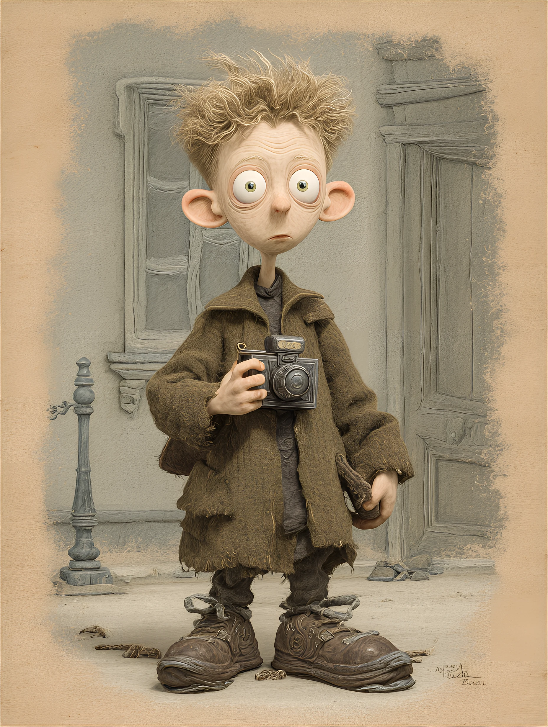 funny caricature, haunted young boy caricature, young caucasian male, 10 years old, with wide eyes, pale skin, ragged clothes, big cartoonish head, exaggerated caricature features, startled expression, wearing dirty brown jacket, oversized boots, holding a camera, claymation caricature style with textured details, textured details, muted colors, whimsical, playful, satirical, creepily captivating, abandoned house environment