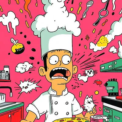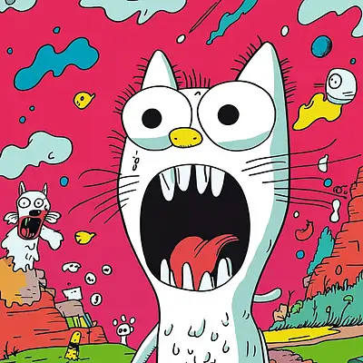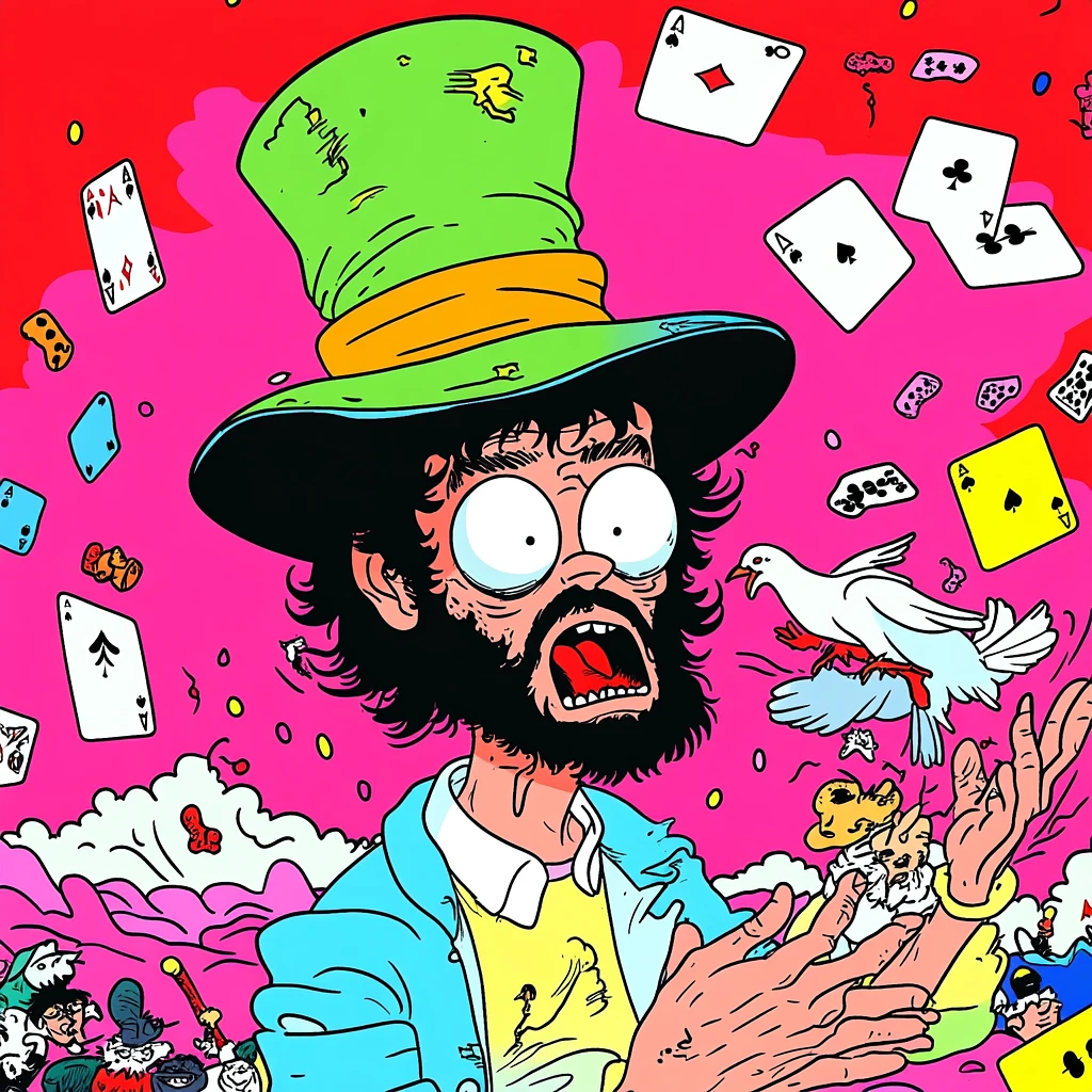 Cartoon illustration of a hapless magician pulling an angry rabbit out of his hat; surrounded by floating playing cards, confused spectators, and a dove escaping from his sleeve; vibrant pink and red background with swirling chaotic energy; bold, dynamic linework with expressive details; intense and dramatic horror-comedy style; high-quality, visually striking, and full of emotion --sref https://s. mj. run/_zJ-Jetzbw0 --stylize 300 --v 6. 1