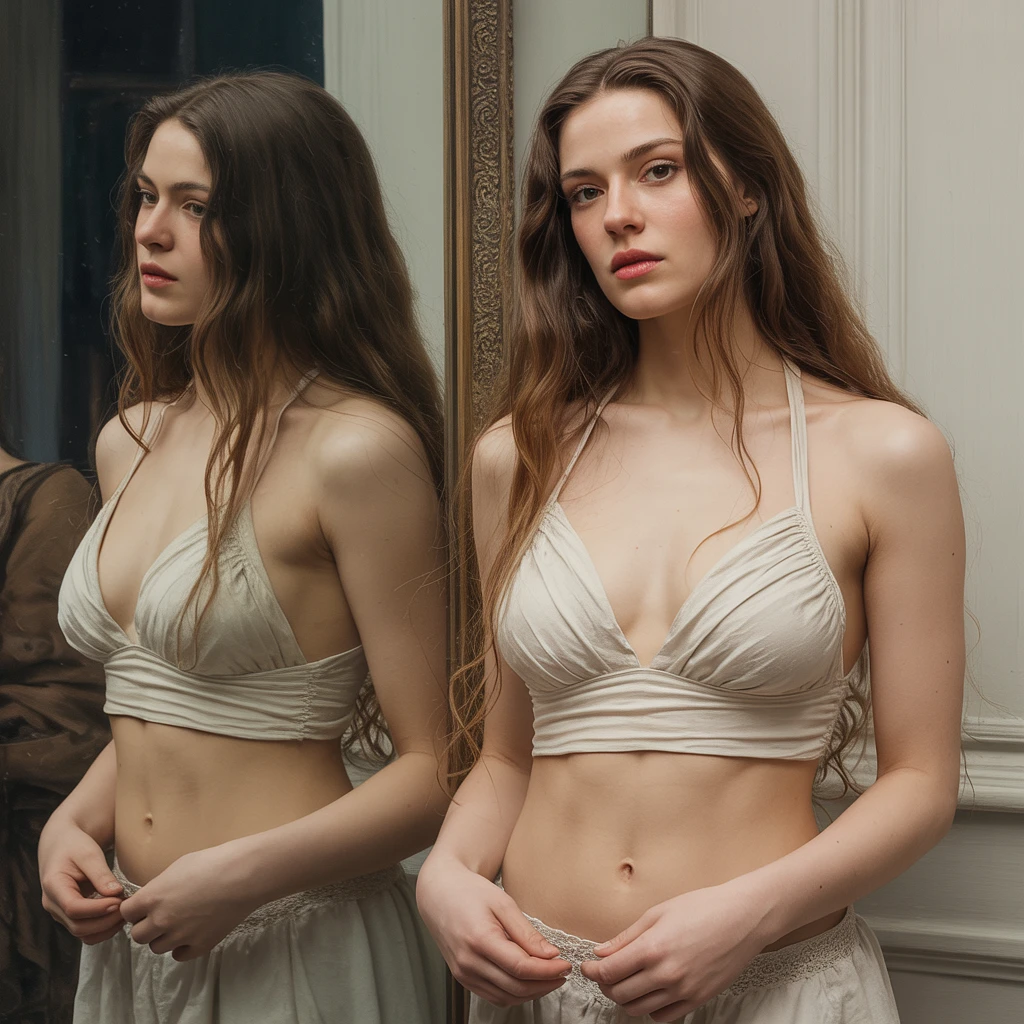 (masterpiece) , 16K, (extremely detailed) , (finely detailed) , the photograph shows a slim, fair-skinned woman with long brown hair, standing in front of a mirror, The lighting is soft, highlighting her voluptuous curves and the texture of her clothes. A drawing of a seductive woman in the style of Frazetta, with soft lines and shapes,
