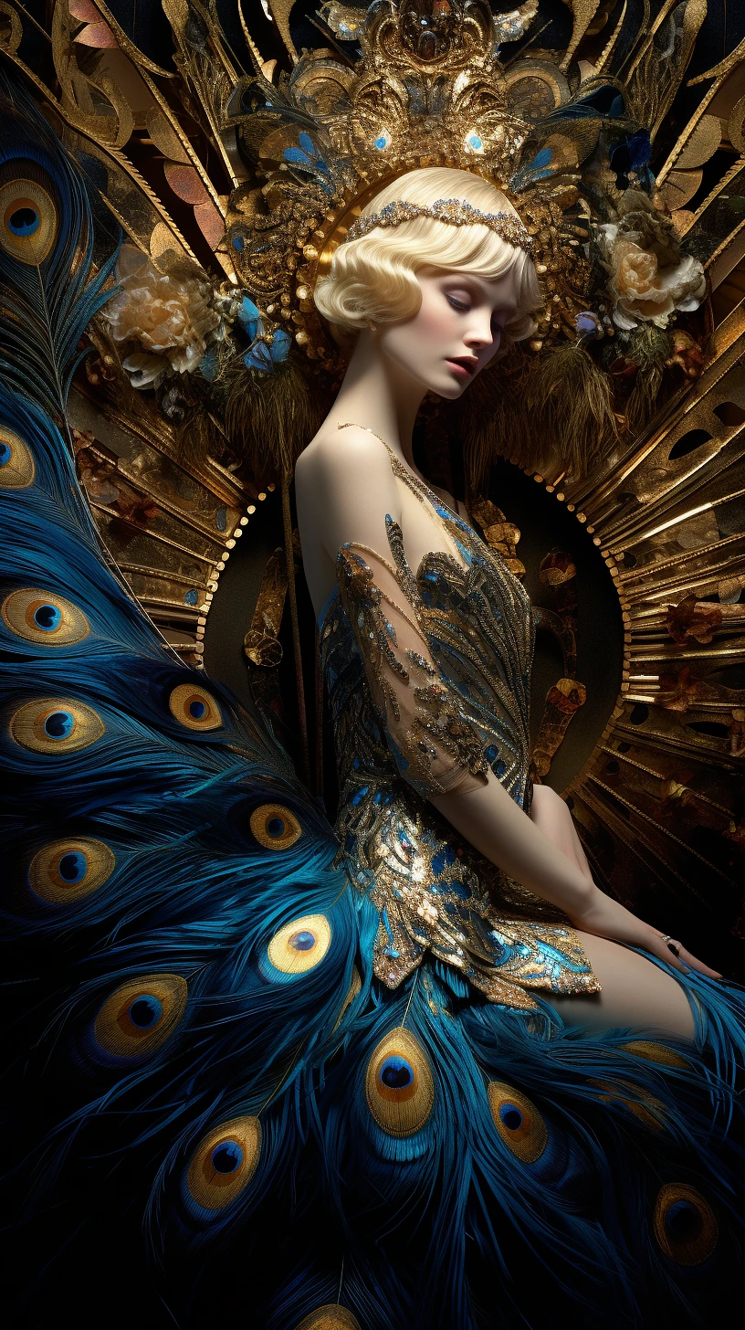 a cinematic still, filmed by guillermo del toro, a beautiful blonde women jazz singer under a spotlight with blue eyes, a peacock fan, gold beaded evening blue gown cinematic art deco theatre stage, spotlight, gold foil trim, highly detailed by Helen Dryden and Paula Scher and Klimt